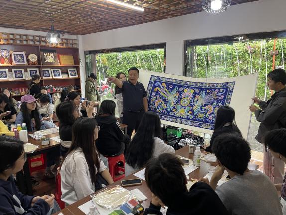 在春海苗族挑花艺术馆,州级非遗传承人张春海老师以“一根绣针承载民族文化”为主题,向学生展示苗族挑花的精妙技艺。他通过清代纹样藏品解析苗族图腾背后的族群记忆,并指导学生将传统挑花针法转化为现代装饰图案。