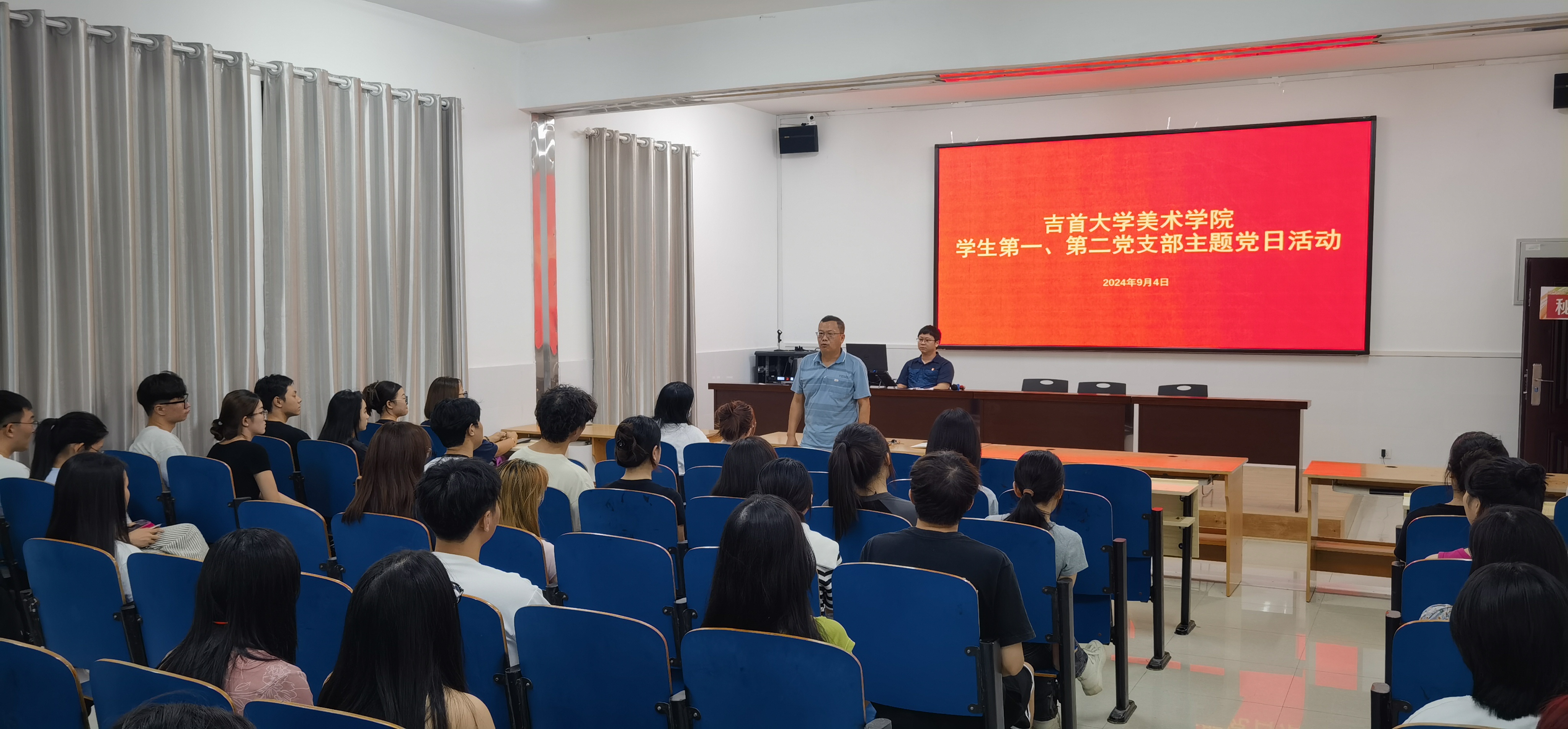为贯彻落实党中央关于学习落实《中国共产党不合格党员组织处置办法》的工作要求,结合“一月一课一片一实践”的主题党日,9月4日晚19:30,学生第一、第二党支部在第5教学楼313教室举行主题党日活动。活动由学生第一党支部书记刘浩主持,学生第二党支部书记陈阳波老师和学生第一、第二党支部全体党员参会,专升本新生党员列席观摩。