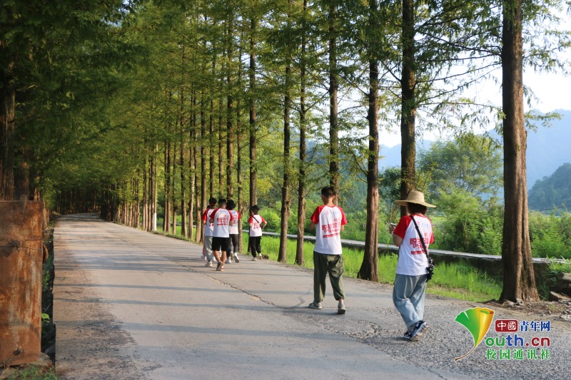 图为志愿者走在马头溪村的村道上,感受秀美的自然景色。在村道两旁,都是高直的水杉树,非常有特色。中国青年网通讯员 李景芬 摄
