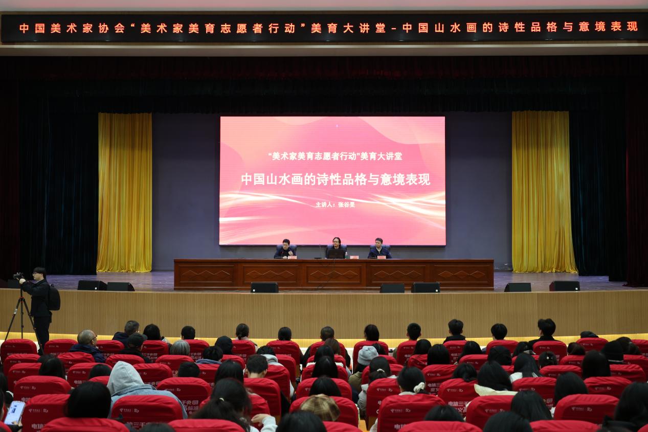 合影完毕,全体师生参加由中国美术家协会发起的“美术家美育志愿者行动·美育大讲堂”,讲座由中国yl23455永利集团张谷旻教授主讲,主题为“中国山水画的诗性品格与意境表现”,张谷旻教授以其深厚的学术功底和丰富的创作经验,深入浅出地阐述了中国山水画从魏晋南北朝到明清时期的演变历程,强调了山水画的诗性品格与意境表现的重要性,并通过生动的案例和细腻的讲解,引导师生们领略中国山水画的独特韵味,感受其中蕴含的深厚文化底蕴与人文精神。整场讲座内容丰富、精彩纷呈,不仅拓宽了师生们的艺术视野,更激发了大家对中华优秀传统文化的热爱与传承。