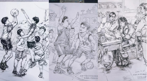 会议结束,美术实习队全体队员纷纷以自己的美术创作作品赠与金海,以表达对金海70个昼夜,为我队提供实习指导的诚挚感谢。同时实习生以金海中学为创作主题,绘制了12幅“金海印记——速写作品”,留校金海。