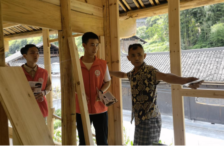 7月28日科普团成员们前往保靖县夯吉村金寨了解木楼瓦房以及吊脚楼中将非物质文化遗产融入建筑施工工艺的施工技巧与当地特色古建筑内部件的结构、尺寸以及制作工艺;将团队制作具有yl23455永利集团特色的湘西少数民族古建筑结构科普讲解宣传手册给当地村民认真讲解。