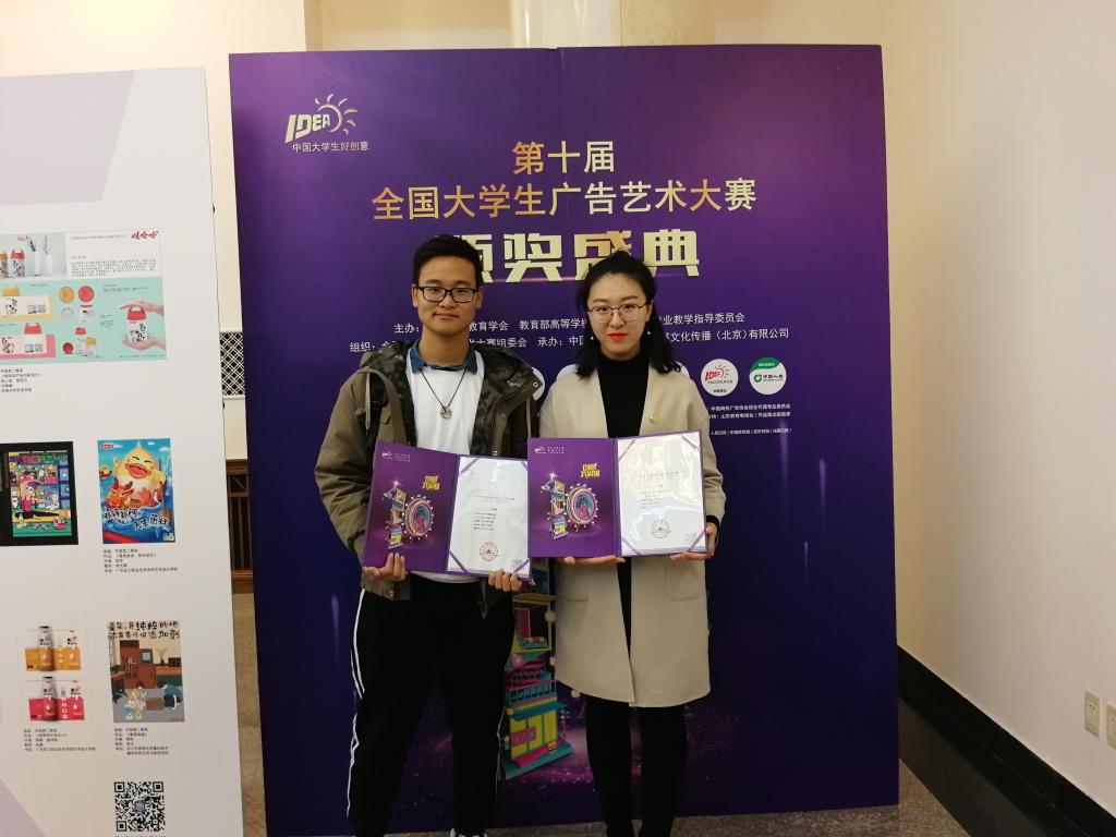 我院党委副书记杜修望、视觉传达教研室主任李波荣为他们颁奖。颁奖过程中杜书记表达了对获奖同学的赞赏,并期待他们在下次的比赛中继续努力。颁奖结束后赵忠鼎老师对历届大广赛获奖的优秀作品进行了讲解与分析,并指出我们与全国一等奖之间的不足与差距,期待我们的下一次比赛可以有新的突破!