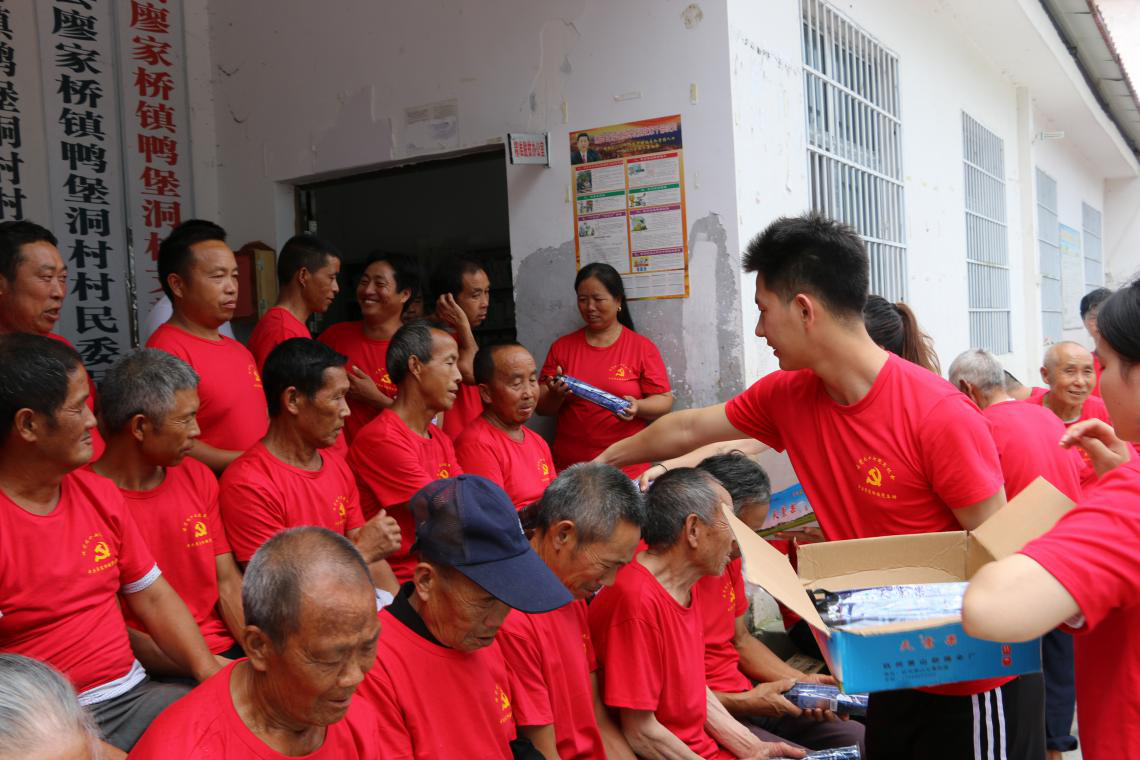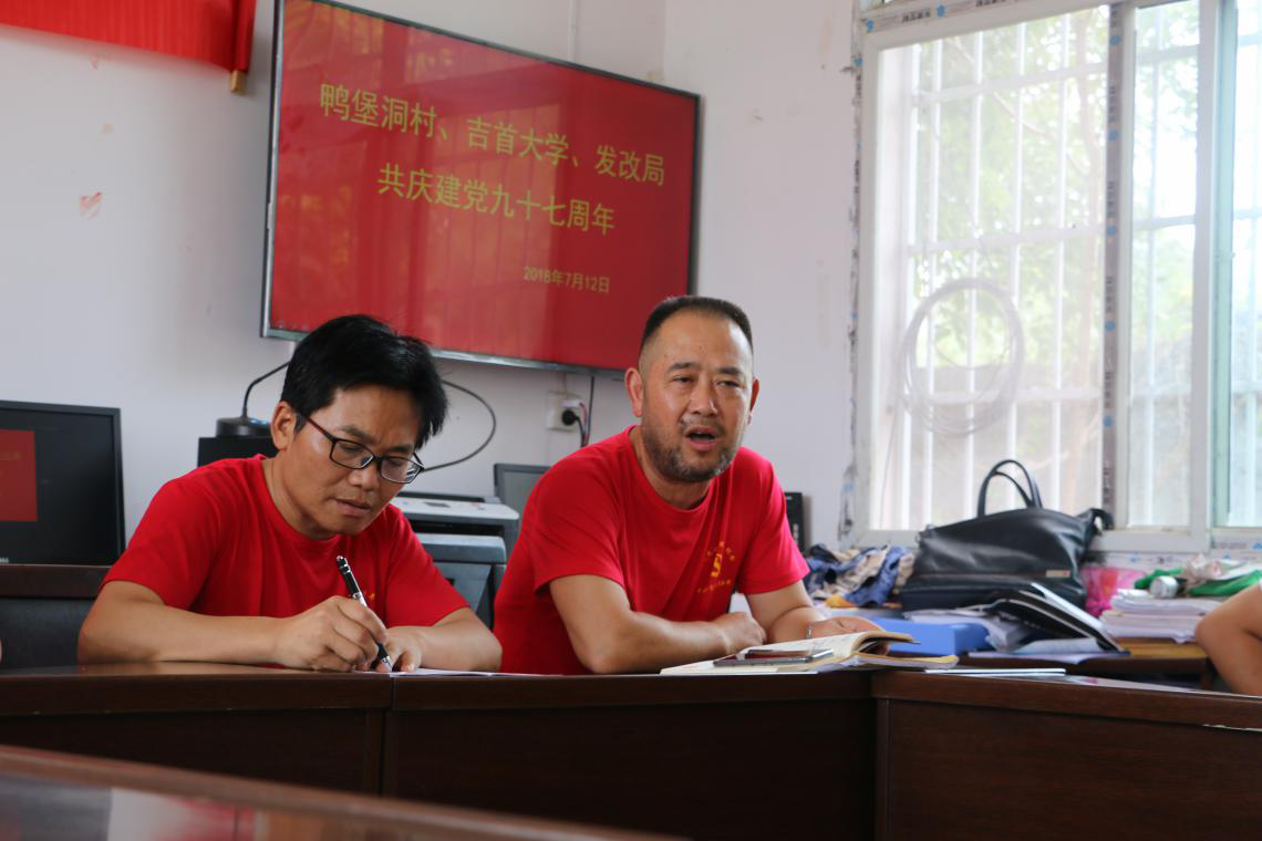 上午10点,实践团全体成员参加了凤凰县发改局在鸭堡洞村举行的“凤凰县发改局开展七一慰问扶贫村贫困党员活动”。鸭堡洞村和腰子坨村全体党员参与此次活动。在活动中,82岁高龄的老党员罗那表的发言让青年党员受益匪浅。他认为,鸭堡洞村是一个青山绿水、大有作为的地方,腰子坨村是一个相对较为偏僻的村庄,但是两者已合并为一个行政村,那么就要相互关爱,相互支持。虽然已经82岁高龄,但他依然以高标准要求自己,在思想上和行为上与党组织保持一致,做一名合格的共产党员。