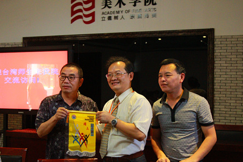 交流会上,台湾桃園市内壢高级中学教师会会长廖经益先生首先将该校的校旗、学生们创作的作品等礼物赠送给学院,然后互相介绍各院校校园环境,最后双方的学生就各自的学习、生活等进行交流,我院学生李晓岩还现场进行书法创作,并在集体签名后将作品赠送给内壢高级中学的师生,最后拍照留念。