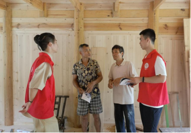 图2科普团成员与夯沙村当地房屋施工过程中的木工师傅进行沟通交流