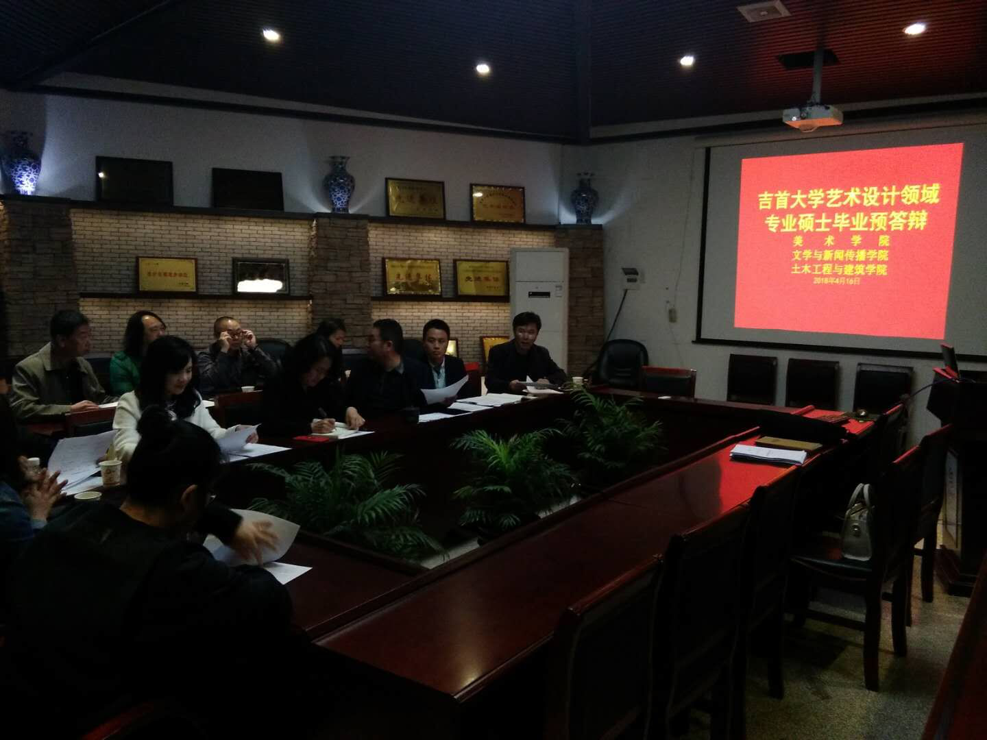 2018年4月16日上午,yl23455永利集团、文化与新闻传播学院、土木工程与建筑学院集中在yl23455永利集团院会议室对2015级艺术硕士进行了预答辩。yl23455永利集团刘俊院长、周亚辉、唐琼、严茅、胡显斌、石雅云老师,文化与新闻传播学院向延桃、陈文敏老师,土木工程与建筑学院李悦丰、刘卫国老师与15位2015级艺术硕士参加了预答辩会议。