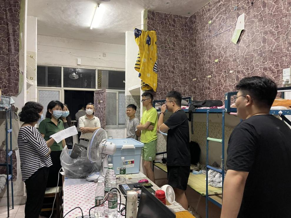 2021年9月18日晚8点,yl23455永利集团党委书记王浓章、副院长李婷婷、副书记杜修望、研究生办主任龙社勤、研究生秘书伍玺臻走访2021级研究生新生宿舍,并发放抗疫物资。