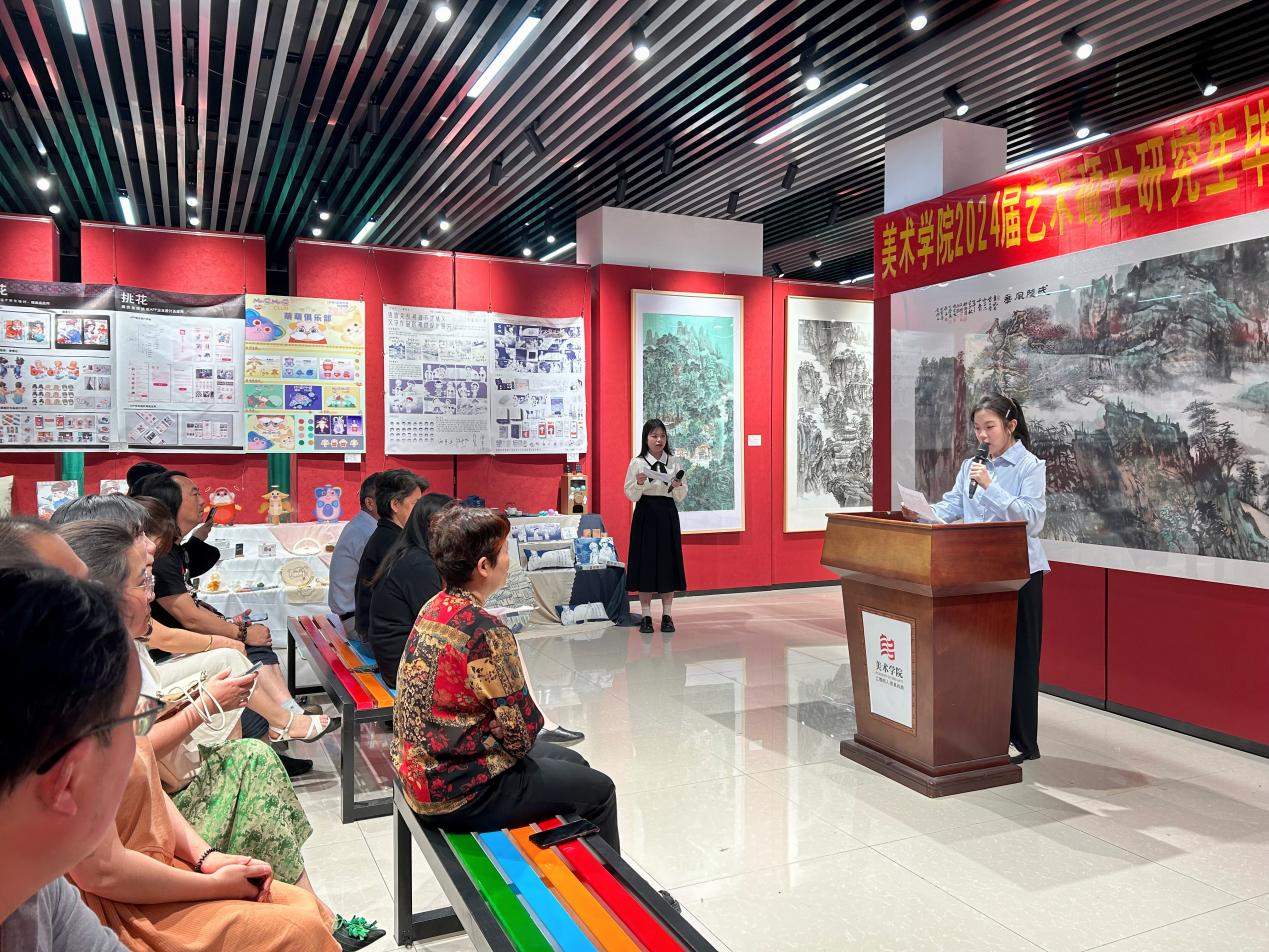 本次毕业设计(创作)作品展开幕式由2024届艺术硕士生邓琳主持,谢玉烨代表全体毕业生发言。展览以“绽放”为主题,汇集了yl23455永利集团28名2024届艺术硕士的毕业设计(创作)作品,作品内容涵盖美术专业领域,艺术设计专业领域中的装饰与室内设计、园林与景观设计、视觉传达与数字媒体艺术三个专业方向研究生作品,作品从不同角度出发,展现了2024届艺术硕士研究生在校的学习成果。